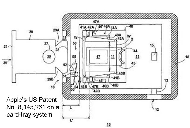 It is no mere coincidence then that Apple’s recently-granted patent, “Ejectable component assemblies in electronic devices,” US Patent No. 8,145,261 filed in 2007, describes a system of “trays that can be loaded with removable modules, inserted through openings in the housings of the devices.” Such a tray-card system would encompass Apple’s nano-SIM design proposal under the so-called “4FF” standard, and thus, seriously limit phone manufacturers to using their patented design specification.