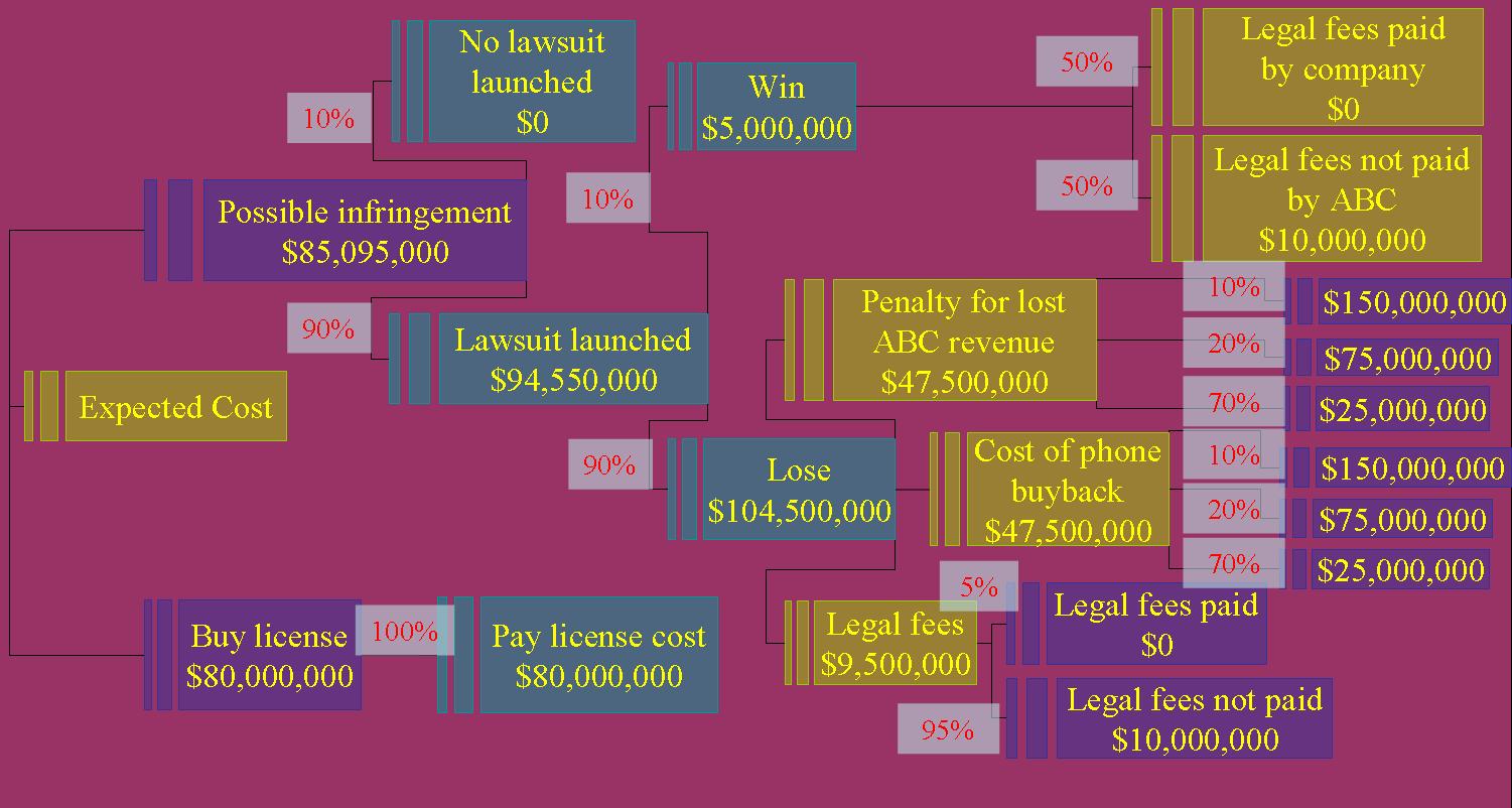 The hypothetical scenario assumed that at the time when mobile phones were first invented, a fictitious company (let’s call them ABC) obtained a 17-year patent on mobile-phone technology. Another party (XYZ) wants to evaluate whether it should begin producing mobile phones without a license, or purchase an $80M license from ABC to produce the mobile phones. The decision tree (also called “extensive form” analysis) for the outcomes and their associated costs and benefits is shown below.