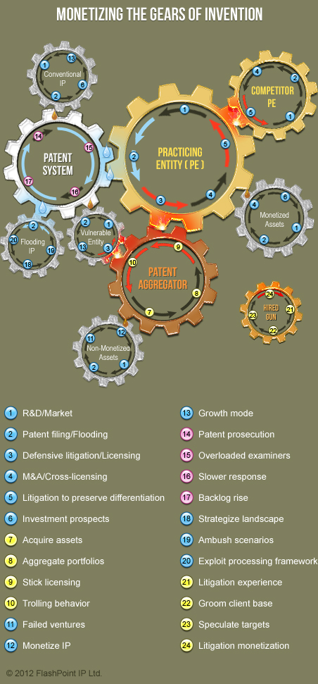 The Patent System (pink-stepped gear depicted) is an “enabling” gear in that it does not directly participate in monetization even when engaged with other gears, except through fee collection which can be considered a form of institutional monetization of IP rights. Whereas the active gears monetize (in the broadest sense) patents through commercialization, licensing, and sale, the Patent System (as well as patent-prosecution law firms – another enabling gear, not shown in the depiction) can be thought to monetize ideas into patent applications and patents.
